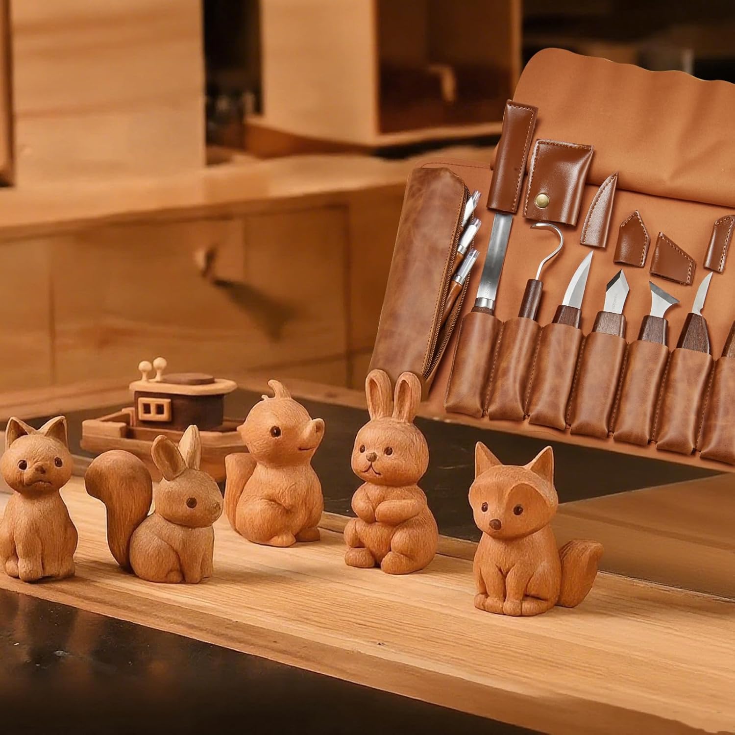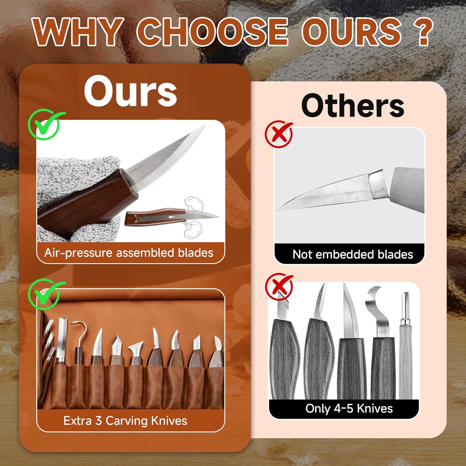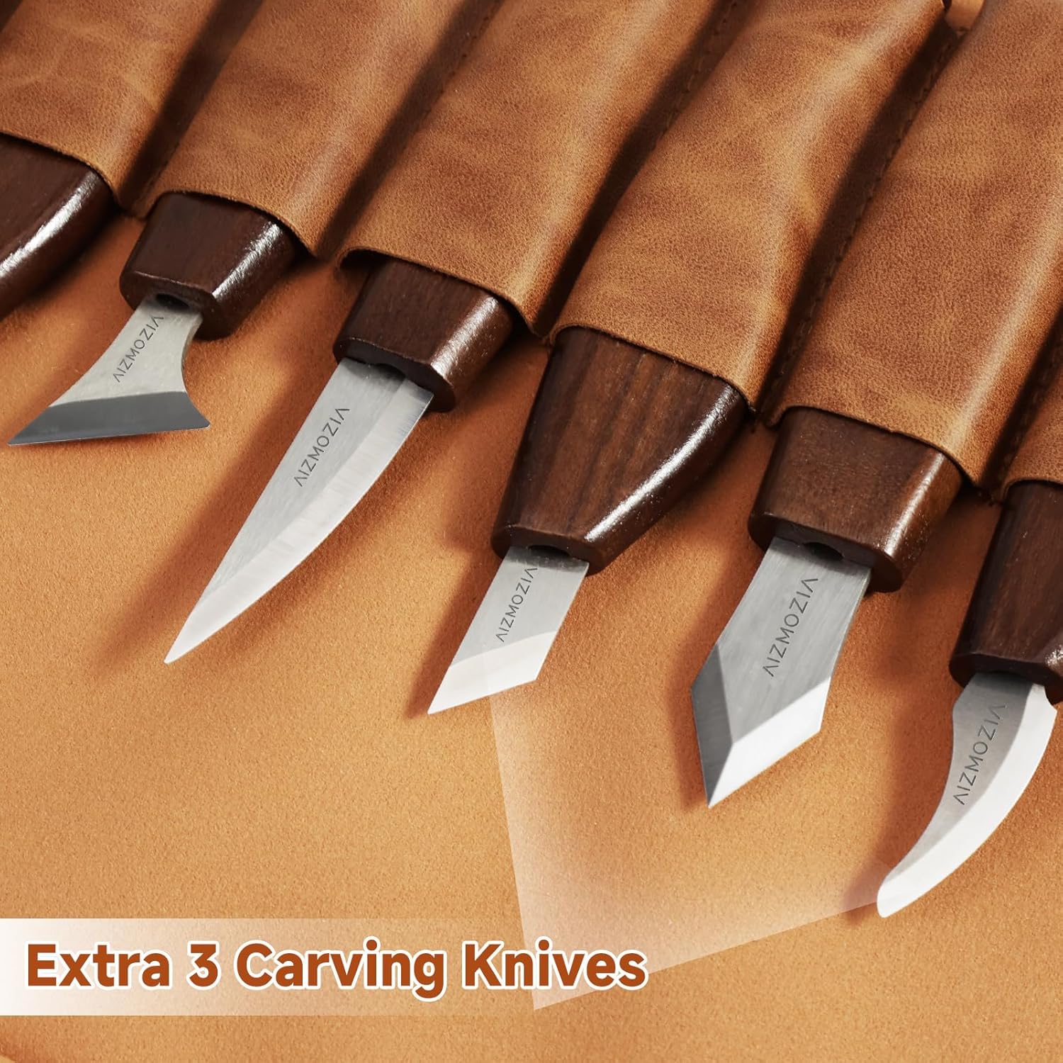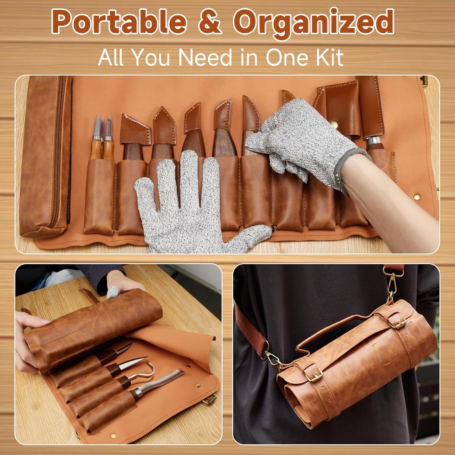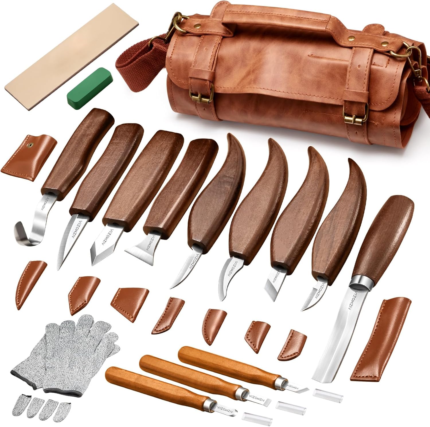 **AIZMOZIA Wood Carving Kit for Beginners – 17PCS Deluxe Whittling Knife Set with Carving Tools, Leather Roll & Gloves – Perfect Starter Gift for Woodworking Hobbyists**